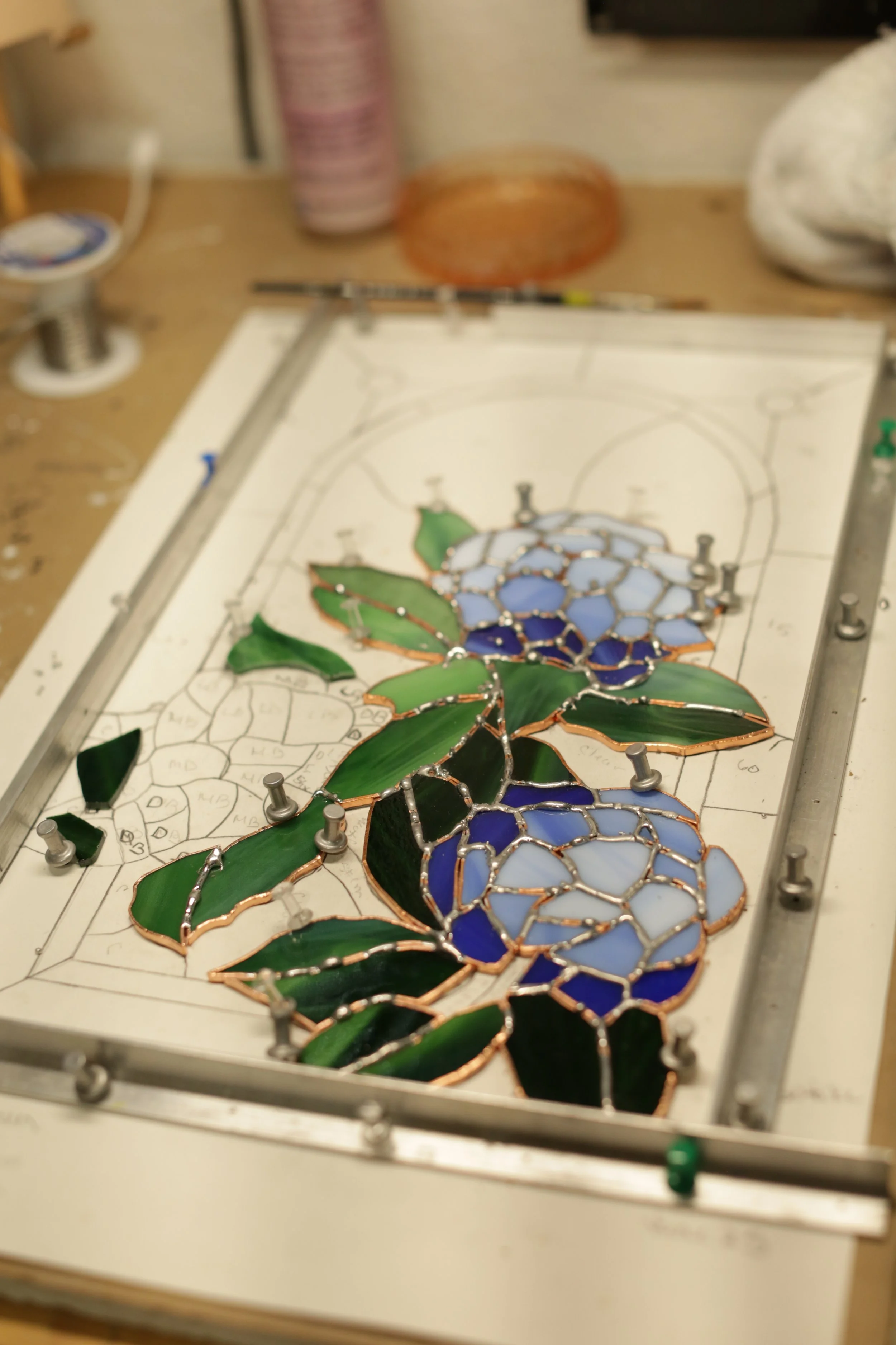 Kim sees the world through light, color, and glass. Her stained glass work is inspired by global travels, blooming gardens, and the flowing elegance of Art Nouveau—especially the dreamy lines of her favorite artist, Charles Rennie Mackintosh.