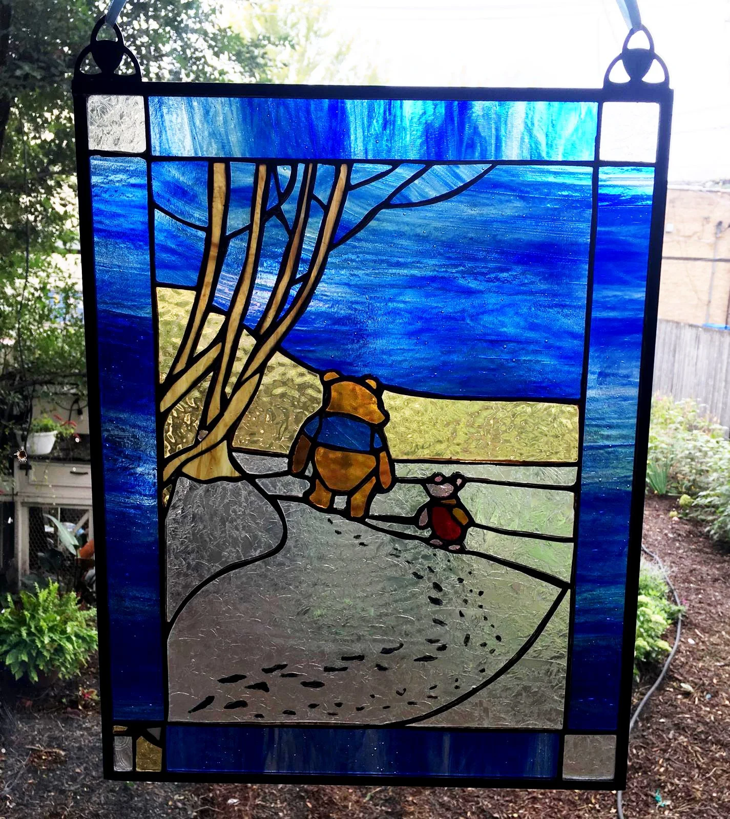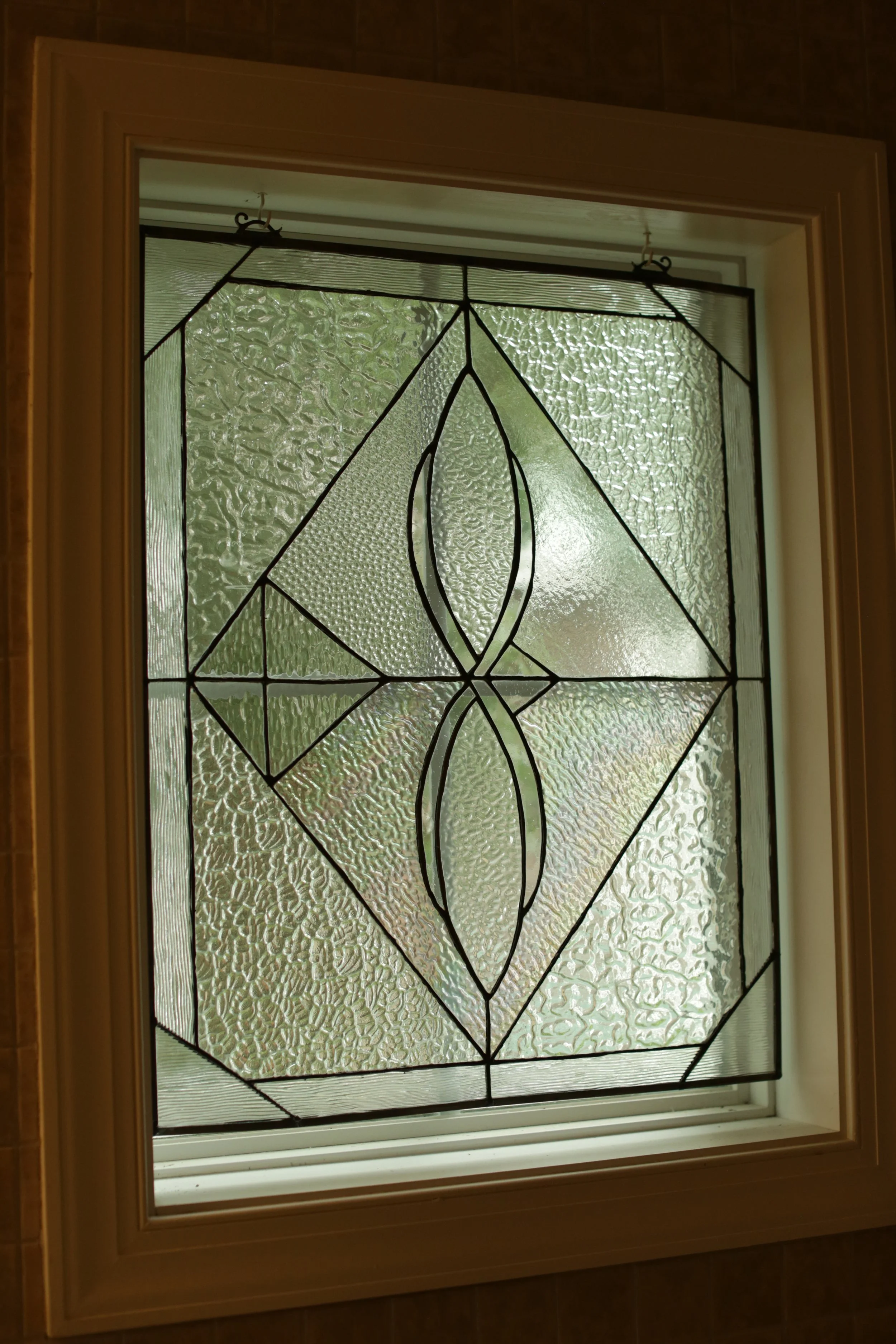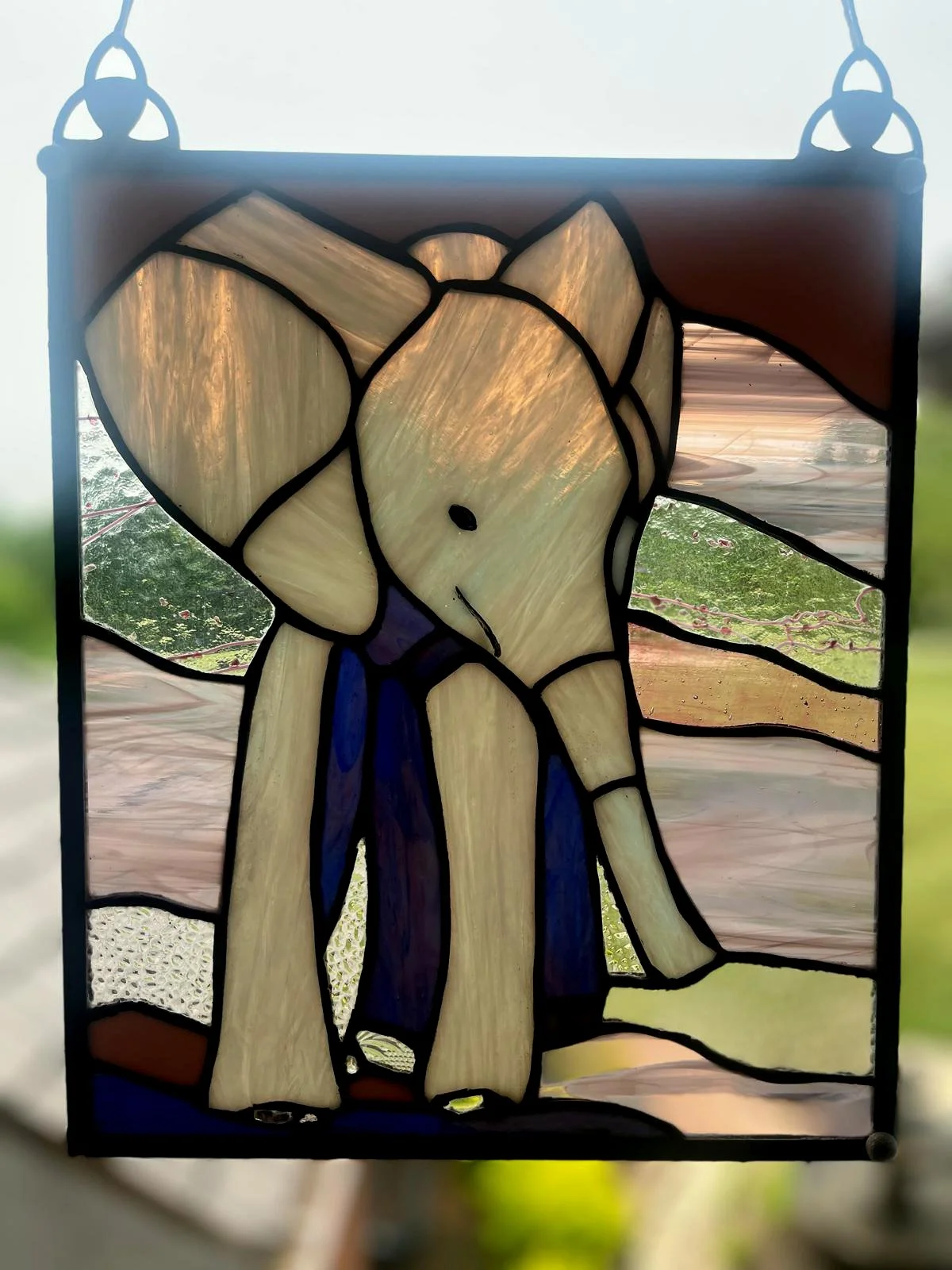 A beautifully crafted stained glass panel of a baby elephant, rendered in soft, natural tones. The elephant is made of light beige and cream opalescent glass, giving it a warm, glowing effect as light passes through. Its large ears and gentle expres View fullsize
