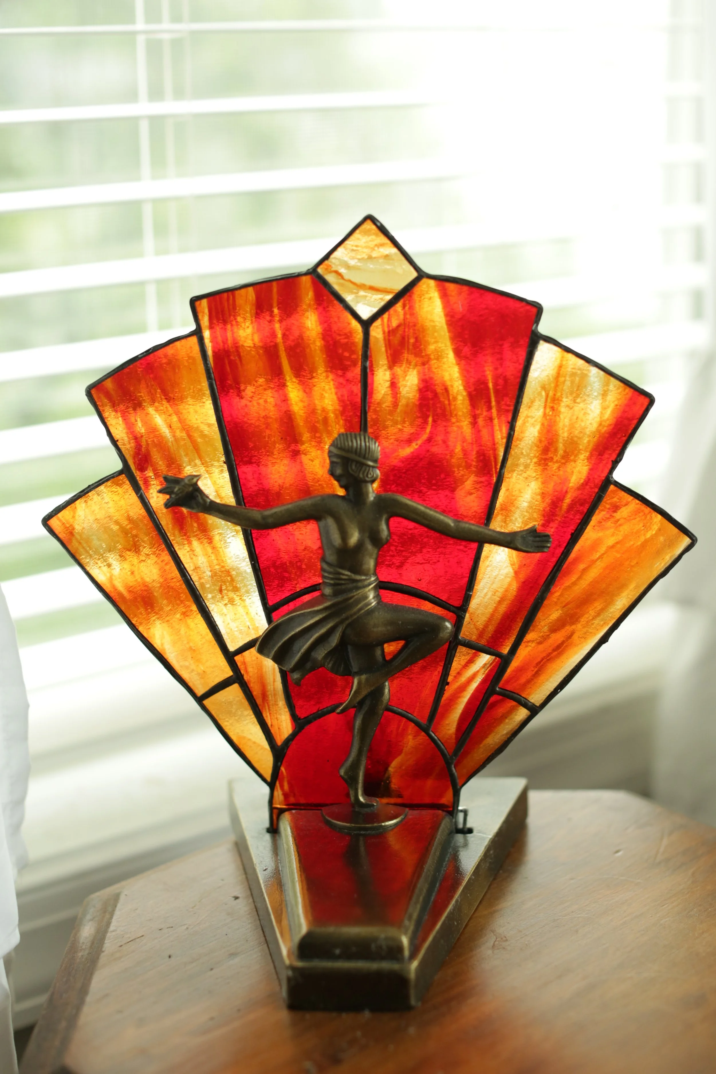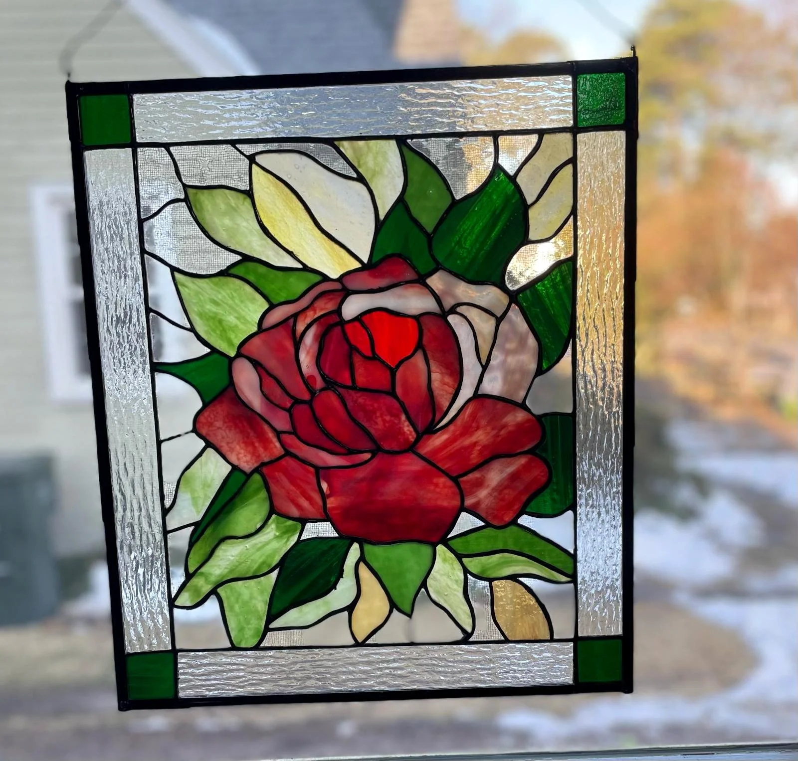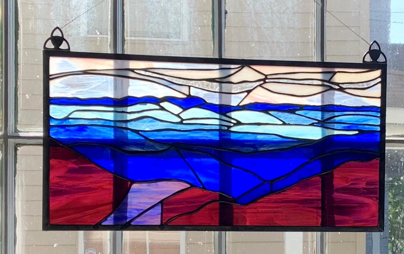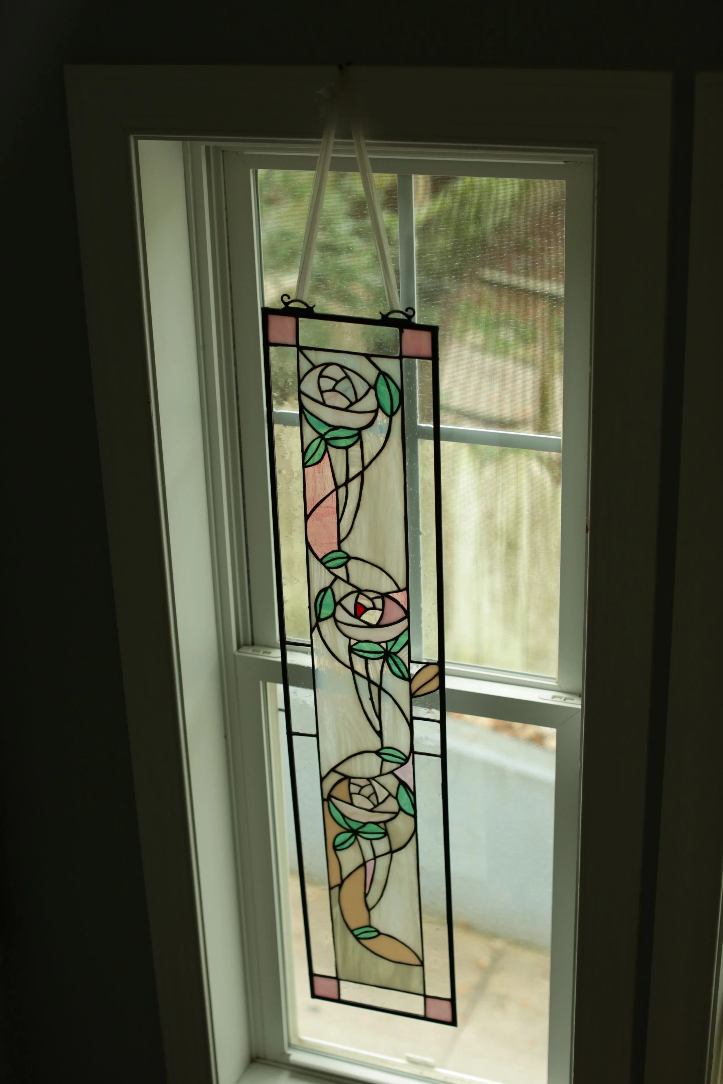 A beautifully crafted stained glass panel of a baby elephant, rendered in soft, natural tones. The elephant is made of light beige and cream opalescent glass, giving it a warm, glowing effect as light passes through. Its large ears and gentle expres View fullsize